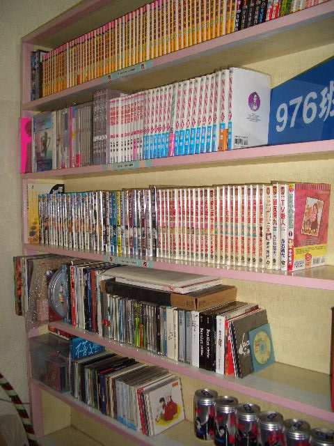 這一面是專門拿來放漫畫、CD之類的東西,第一排一看就知道 是那出了八百年還出不完的柯南系列,我希望他擺滿一排就好,第二排則是矢澤愛系列,其實這系列大多是我妹的,我的部份只有DVD跟天國之吻,最旁邊是我附中60周年校慶的時候帶回來的班牌,為了搶班牌我可是跑很快的呢!