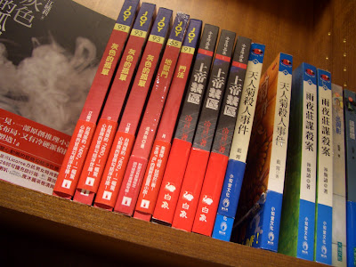 隔天到了年會會場之前,還不忘去看看我和店員的每週諜對諜是誰獲勝,果然移到非宣傳區的架上,就比較沒有被移走了,三本《上帝禁區》還乖乖的站在「本土推理」的區域,倒是旁邊的書多了兩本《雨夜莊謀殺案》和《天人菊殺人事件》,反倒是我要買的《布袋戲殺人事件》不知道被誰捷足先登了,嗚嗚。